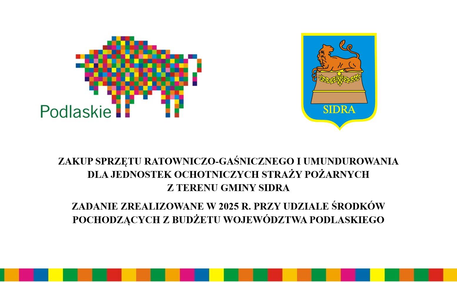 Urząd Marszałkowski Województwa Podlaskiego w 2025 roku przyznał Gminie Sidra dotację w kwocie 20 000 złotych na zakup sprzętu ratowniczo – gaśniczego dla Ochotniczych Straży Pożarnych z terenu gminy Sidra. Powyższe środki postanowiono przekazać na rozwój OSP w Sidrze, OSP Jacowlany i OSP Chwaszczewo.