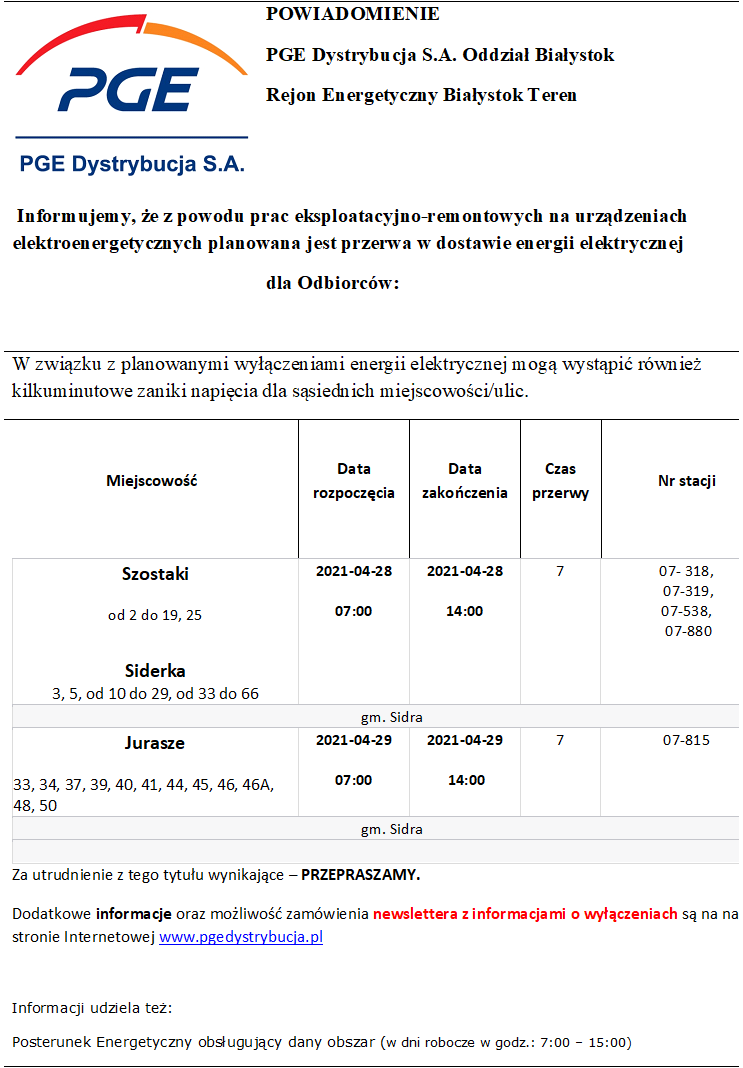 Informacja o planowanych przerwach w dostawie energii elektrycznej!