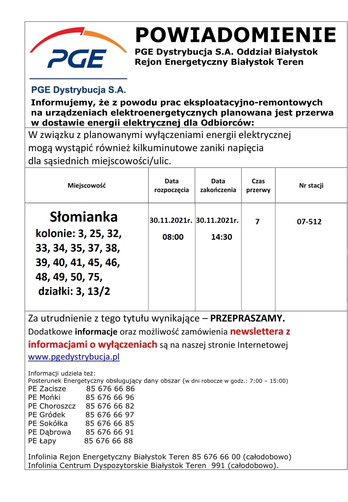 Informacja o planowanych przerwach w dostawie energii elektrycznej w dn. 30.11.2021 r.