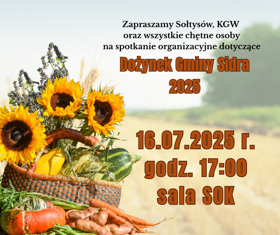 Zapraszamy na spotkanie organizacyjne w dn. 16.07.2025 r. dotyczące Dożynek Gminy Sidra!