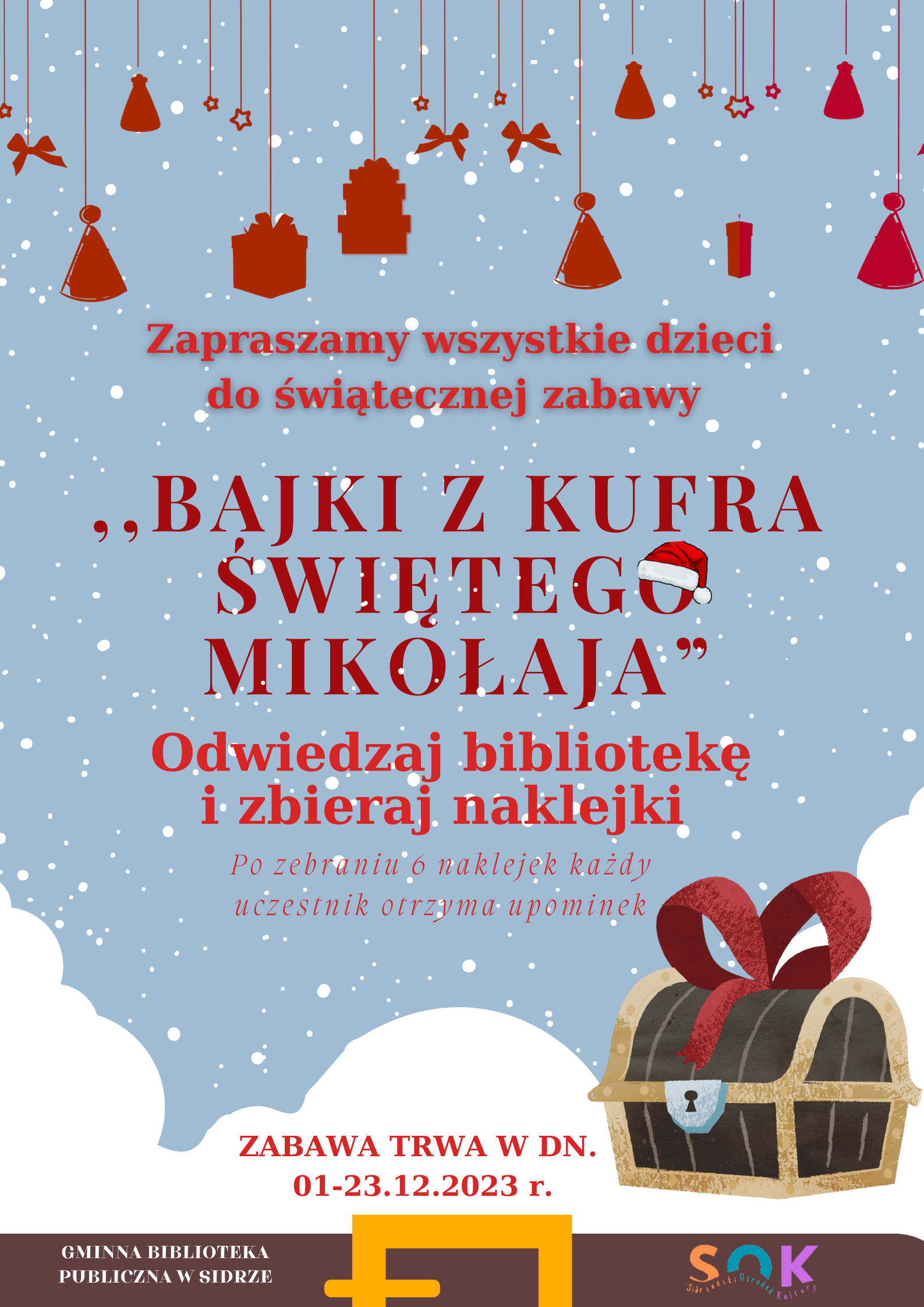 Zapraszamy wszystkie dzieci do świątecznej zabawy ,,Bajki z Kufra Świętego Mikołaja". Aby wziąć udział w zabawie wystarczy odwiedzać Gminną Bibliotekę Publiczną w Sidrze i zbierać naklejki od dnia 01.12.2023 r. do 24.12.2023 r. Po zebraniu 6 naklejek każdy uczestnik otrzyma upominek.